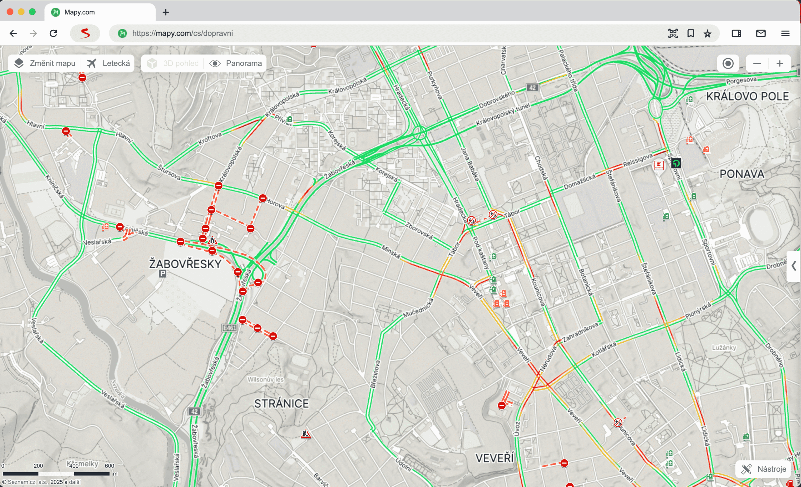 Dopravní mapa v Mapy.com je speciálně navržená pro motoristy a nabízí komplexní informace o dopravní situaci. Zobrazuje např.