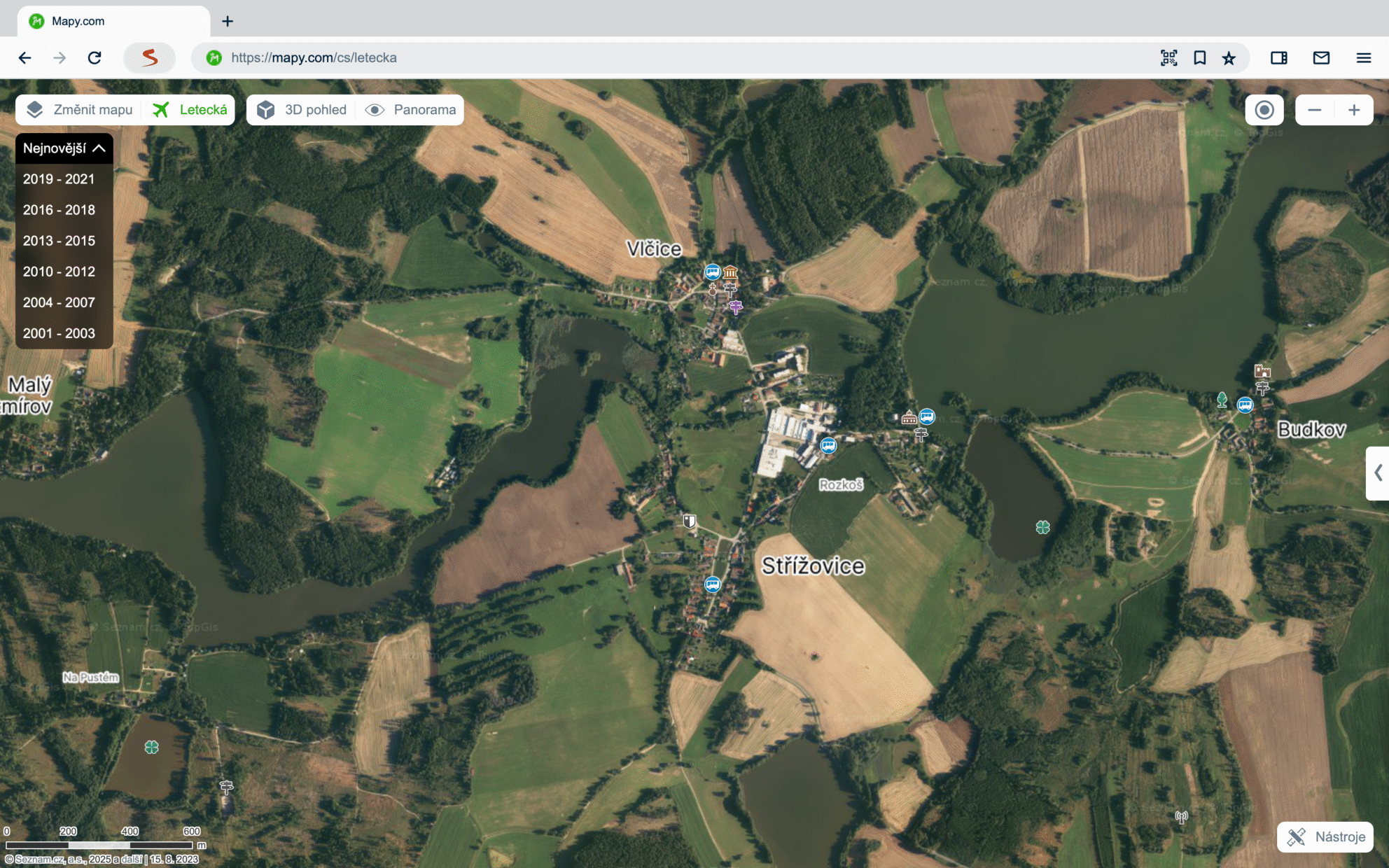 - Archivní snímky: Pro území ČR si můžete kliknutím na rozbalovací menu v levém horním rohu zobrazit kromě aktuálních leteckých snímků i historické letecké snímky z let 2019–2021, 2016–2018, 2013–2015, 2010–2012, 2004–2007, 2001–2003. Pro území Slovenska poté najdete historické snímky z let 2017–2019, 2014–2016, 2011–2013