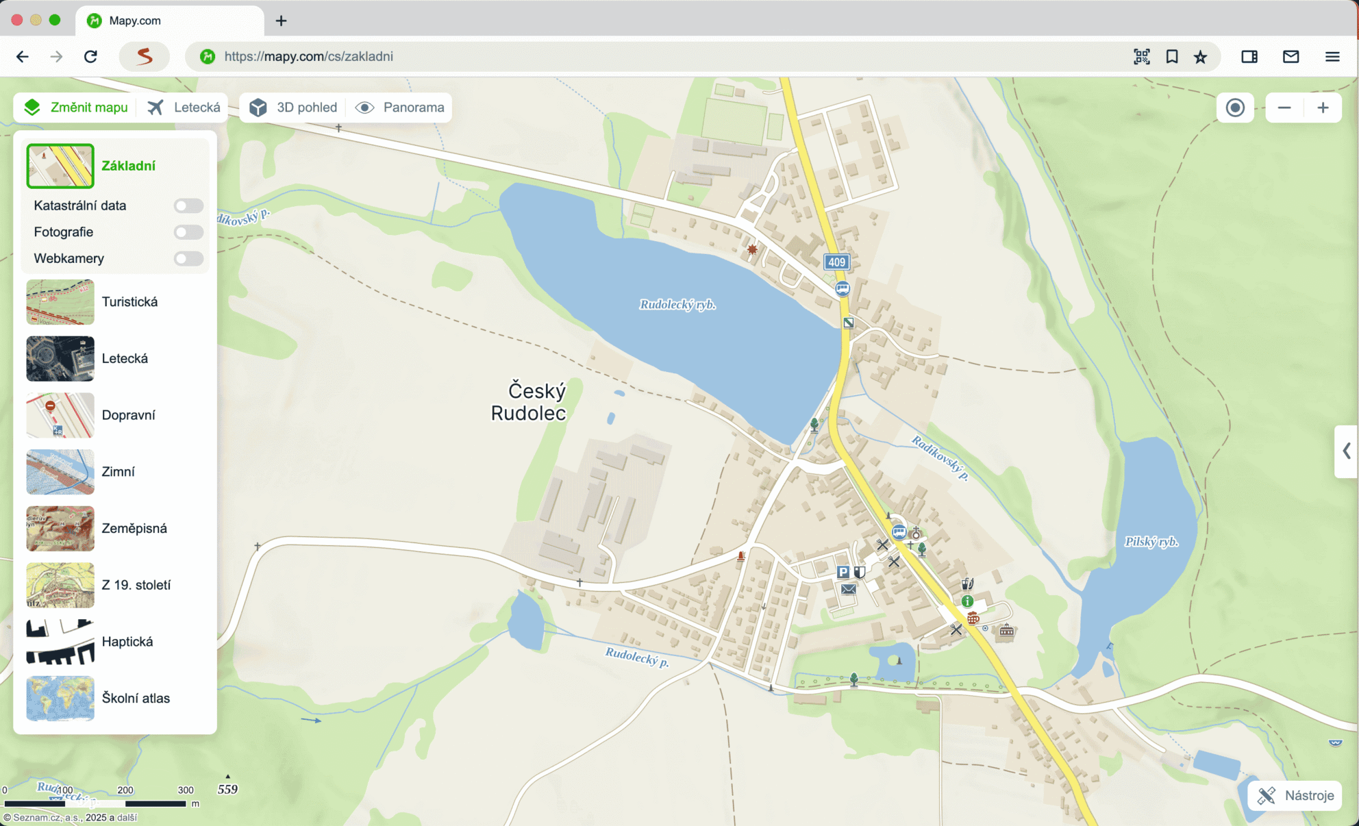 Letecký mapový podklad v Mapy.com kombinuje data ze satelitních a leteckých snímků pro zobrazení terénu v různých úrovních detailu. Poskytuje detailní pohled na krajinu a města z ptačí perspektivy, což vám usnadňuje orientaci a plánování tras. Díky archivu historických snímků je navíc možné sledovat vývoj krajiny v čase. Mapu je možné zobrazit ve 3D pohledu.