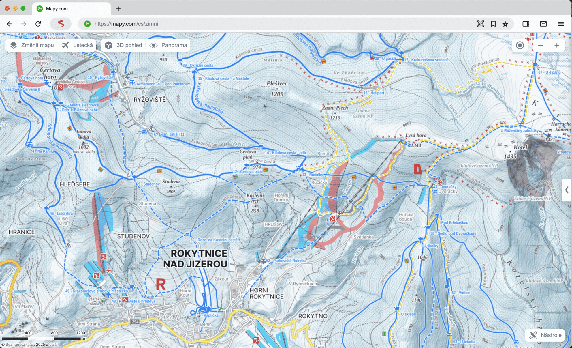 - Údaje o údržbě tras: Na vybraných trasách je zobrazena informace o poslední úpravě, s barevným odlišením dle stáří úpravy (data jsou dostupná od začátku zimní sezóny)
