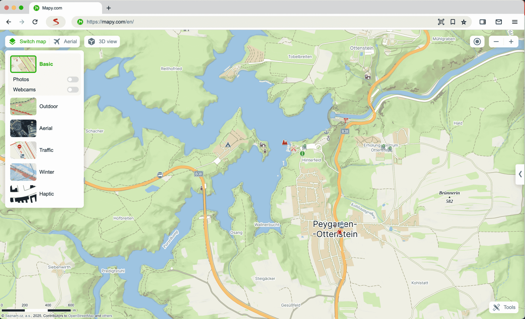 Der Luftbildkartenhintergrund in Mapy.com kombiniert Daten aus Satelliten- und Luftbildern, um das Gelände in verschiedenen Detailebenen darzustellen. Er bietet einen detaillierten Blick auf Landschaften und Städte aus der Vogelperspektive, was Ihnen die Orientierung und Routenplanung erleichtert. Dank des Archivs historischer Aufnahmen ist es außerdem möglich, die Entwicklung der Landschaft im Laufe der Zeit zu beobachten. Die Karte kann in der 3D Ansicht angezeigt werden.