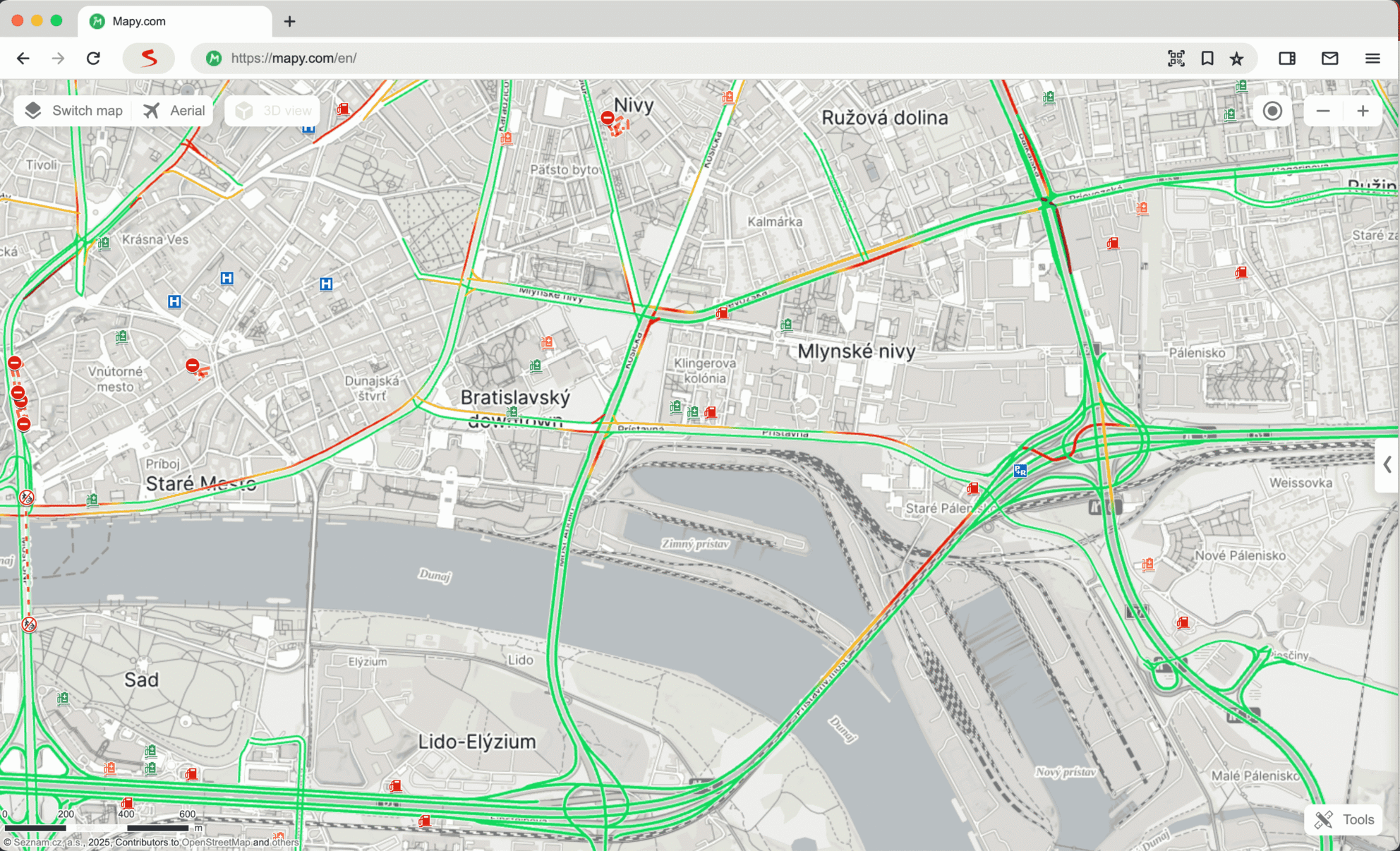 Die Verkehrskarte in Mapy.com ist speziell für Autofahrer konzipiert und bietet umfassende Informationen zur Verkehrssituation. Sie zeigt z.B.