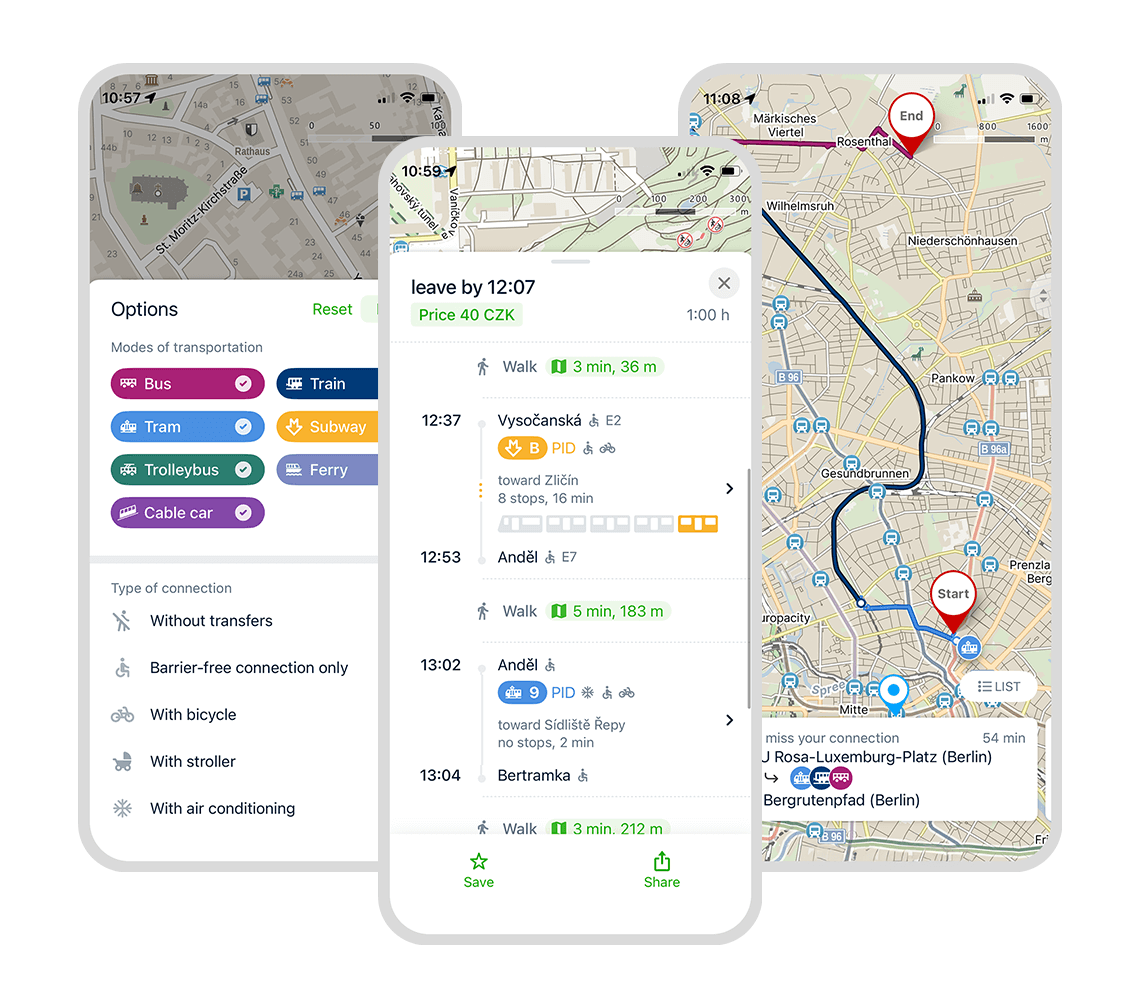 Los horarios se obtienen directamente de los transportistas y su disponibilidad depende de acuerdos mutuos. Actualmente, se pueden buscar conexiones en toda la República Checa. Después de ingresar el inicio y el destino, la ruta se busca automáticamente. Las conexiones encontradas se muestran en bloques separados en el panel lateral derecho, ordenadas una debajo de la otra. En el mapa siempre se muestra la primera conexión encontrada.
