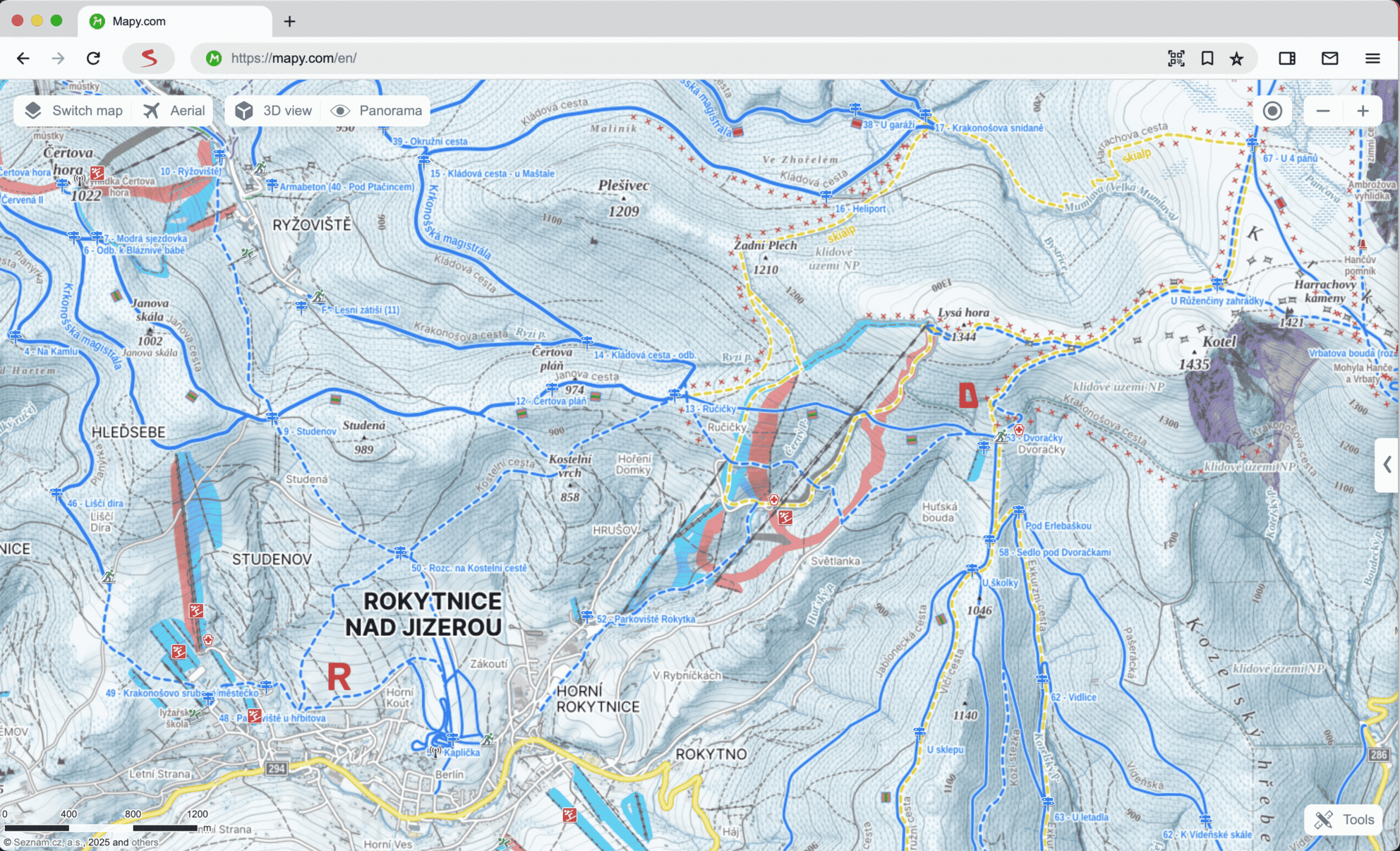 Il fondo cartografico aereo in Mapy.com combina dati di immagini satellitari e aeree per visualizzare il terreno a diversi livelli di dettaglio. Offre una vista dettagliata su paesaggio e città dall’alto, facilitando l’orientamento e la pianificazione delle rotte. Grazie all’archivio di immagini storiche, è possibile inoltre osservare l’evoluzione del paesaggio nel tempo. La mappa può essere visualizzata in Vista 3D.