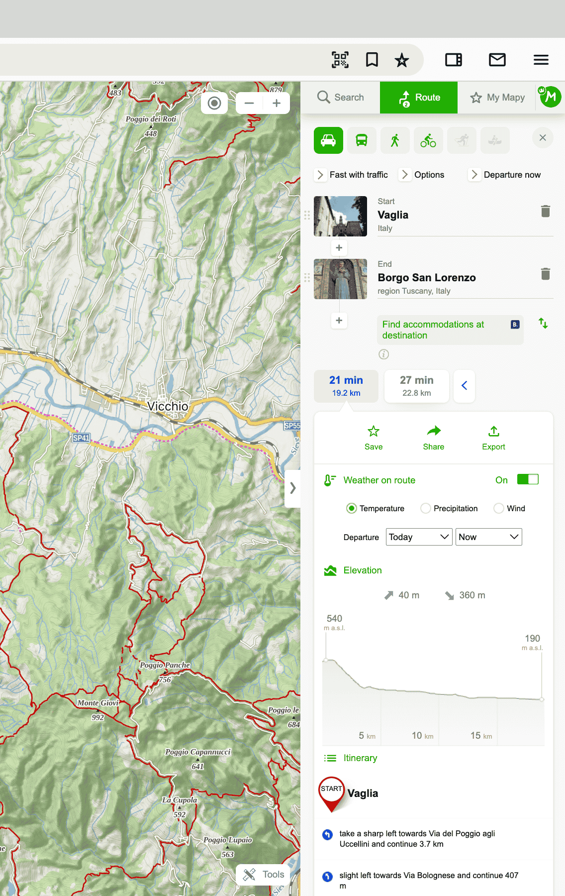 Planowanie podróży między dwoma lub więcej miejscami jest możliwe zarówno na stronie Mapy.com, jak i w aplikacji mobilnej.