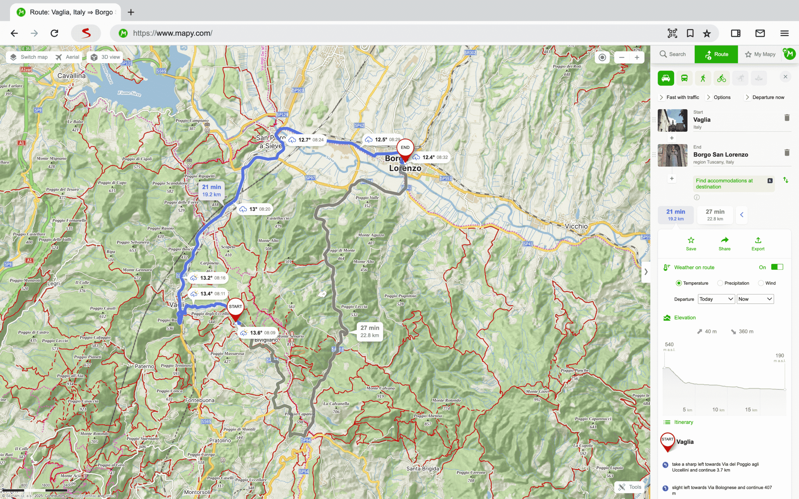 Po wybraniu docelowej destynacji, Mapy.com automatycznie obliczą trasę dla wybranego typu transportu i zaproponują ewentualne alternatywy. Te można przełączać zarówno na mapie, jak i za pomocą przycisków w karcie planera (każda alternatywa jest oznaczona czasem i odległością). Trasa wyświetli się niebieską linią, przy czym start i cel są oznaczone balonikami z opisami Start i Cel.